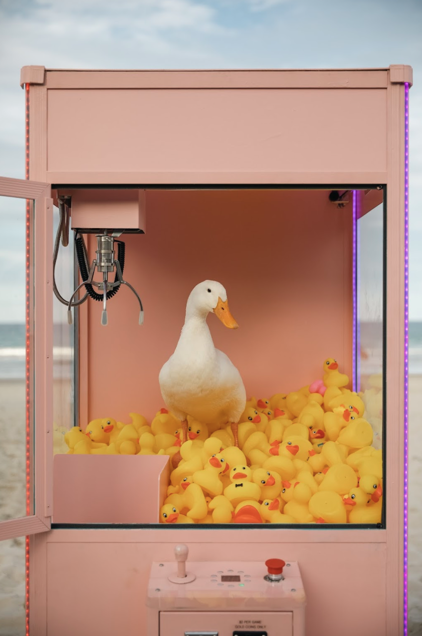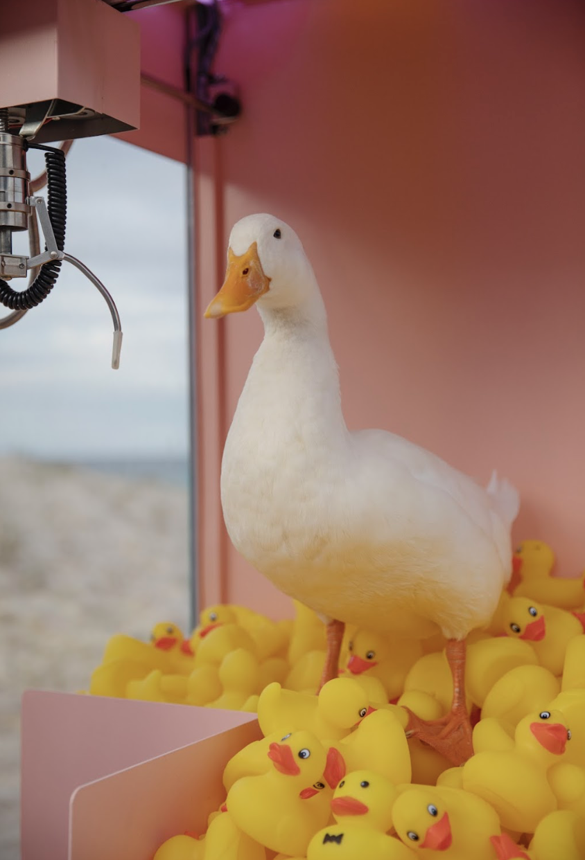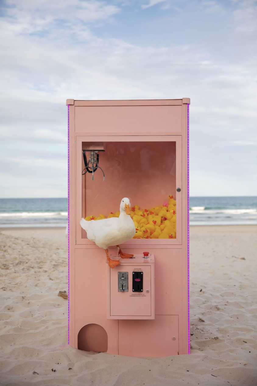 'Plucka Duck’ consists of an arcade claw machine filled with rubber ducks.The sculpture explores the idea of technology taking over the environment and its impact on animals. Australia has the worst mammal extinction rate of any country in the world. Patrons are invited to use the machine by donating $2 and win a rubber duck. All gold coins from the Claw Machine were donated to Currumbin Wildlife Hospital.